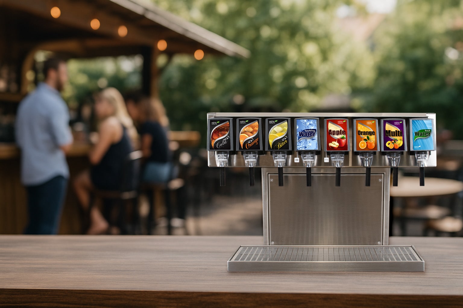 It suits hotel bars and restaurants, as well as poolside areas and outdoor setups. It offers still and carbonated drinks, water, and even optional beer or wine dispensing.